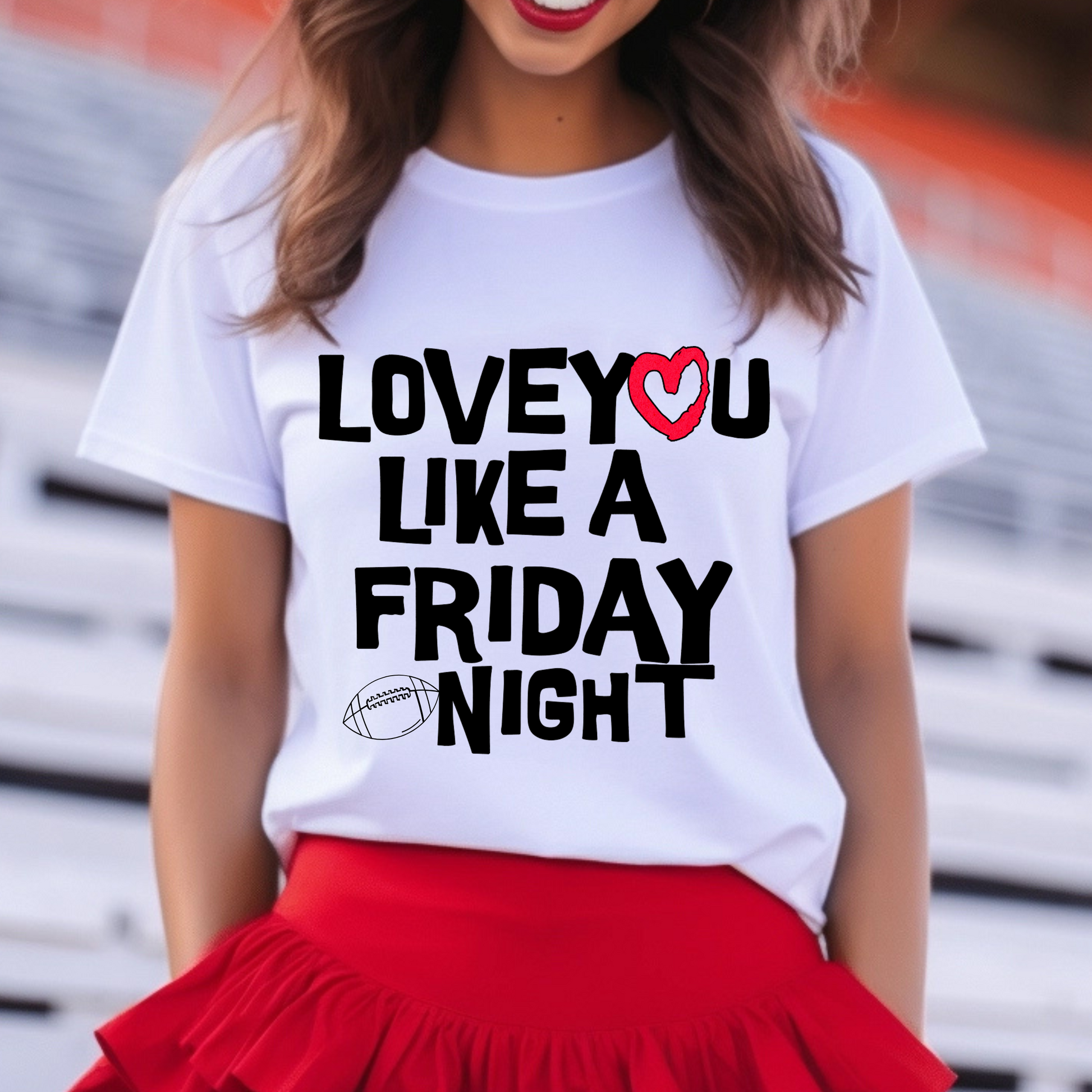 Celebrate the thrill of game night with this playful "Love You Like a Friday Night" design. Perfect for football fans who know that nothing beats the excitement of cheering on your team and sharing that special Friday night feeling with someone you love. Wear it to show your passion for both football and fun!